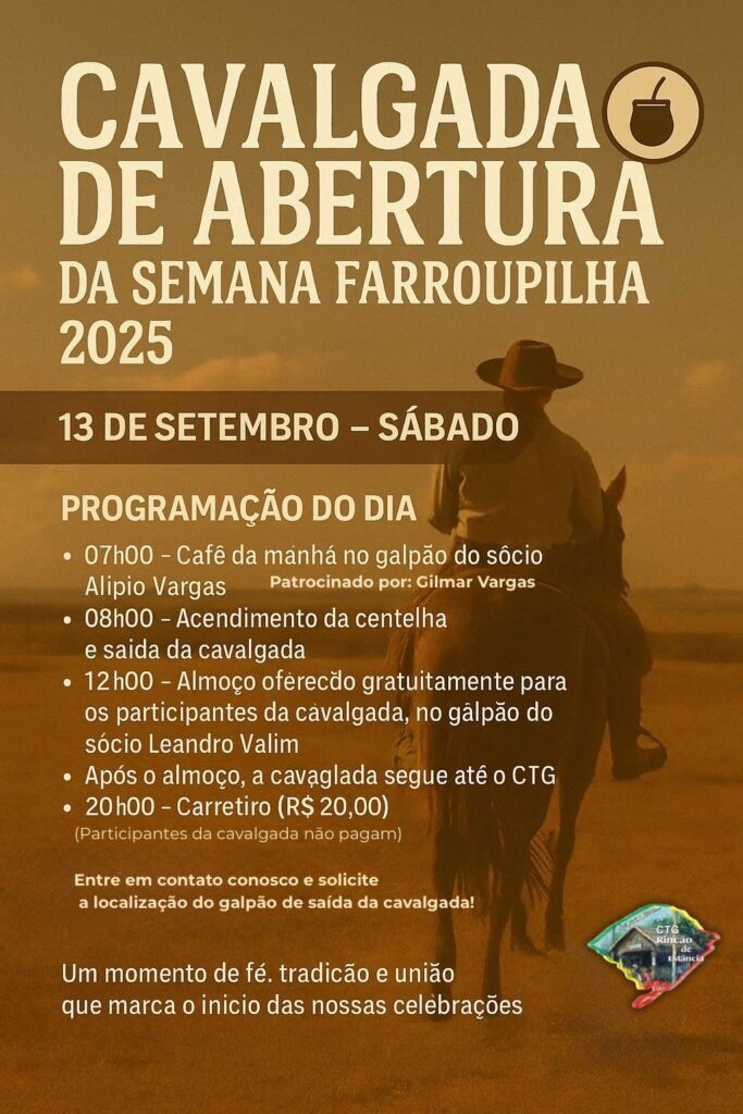 A abertura oficial acontece no sábado, dia 13 de setembro, com a tradicional Cavalgada da Centelha Crioula. O encontro inicia às 7h com café da manhã no galpão do sócio Alípio Vargas, seguido do acendimento da centelha e saída da cavalgada às 8h. Ao meio-dia, os cavalarianos serão recebidos com almoço gratuito no galpão de Leandro Valim, e à noite, a confraternização continua no CTG com carreteiro ao valor de R$ 20,00.