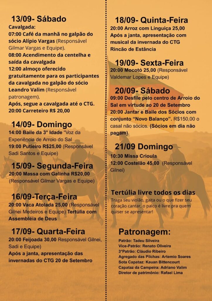- 17/09 (Quarta): Feijoada (R$ 30,00) e apresentação das invernadas do CTG 20 de Setembro.
