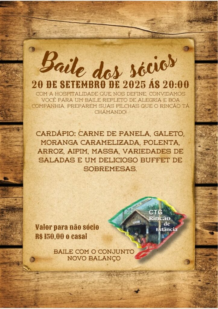 - 20/09 (Sábado): Desfile Farroupilha pelo centro de Arroio do Sal e, à noite, o Baile dos Sócios com o grupo Novo Balanço. O jantar terá cardápio especial com carne de panela, galeto, moranga caramelizada, polenta, massas, saladas e sobremesas. O valor para não sócios é de R$ 150,00 o casal.