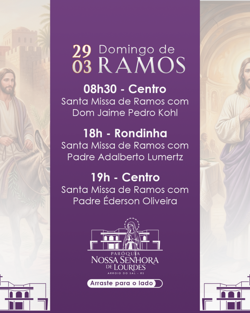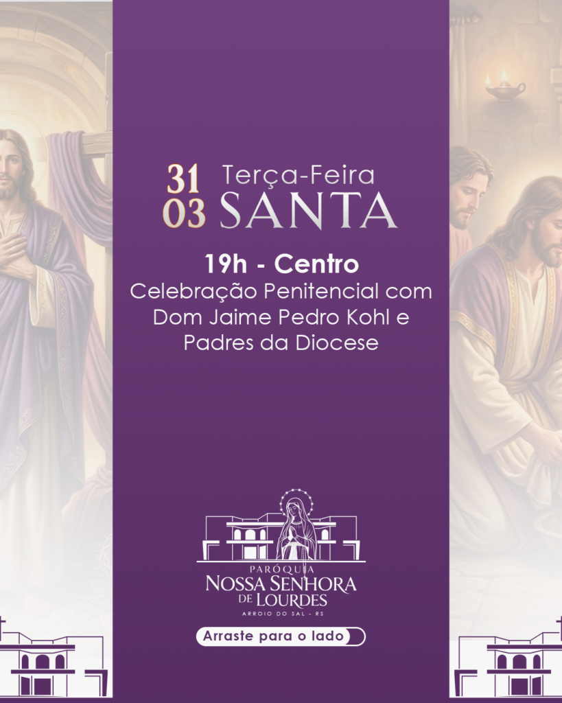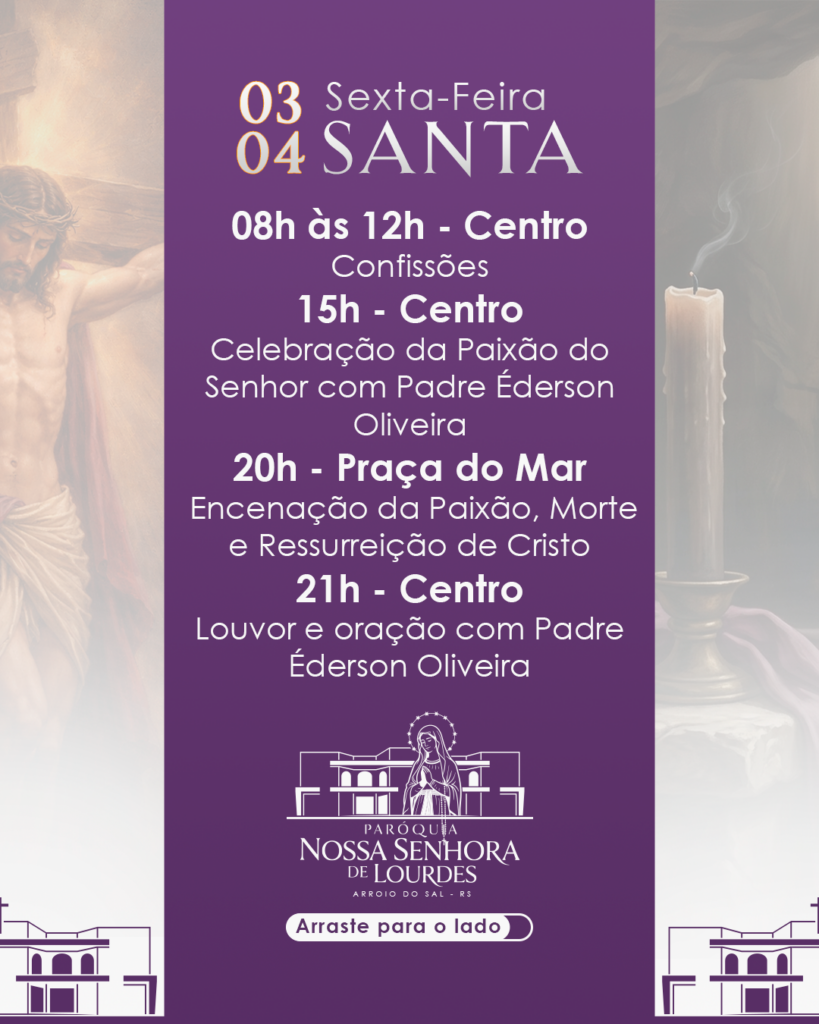 A Semana Santa é um dos perío-dos mais importantes para a Igreja Católica, marcado por momentos de fé, reflexão e renovação espiritual. Em Arroio do Sal, a pro-gramação religiosa -e que também faz parte da programação oficial do município- reúne celebrações em diferentes comunidades, convidando os fiéis a viverem intensamente cada etapa desse tempo litúrgico.