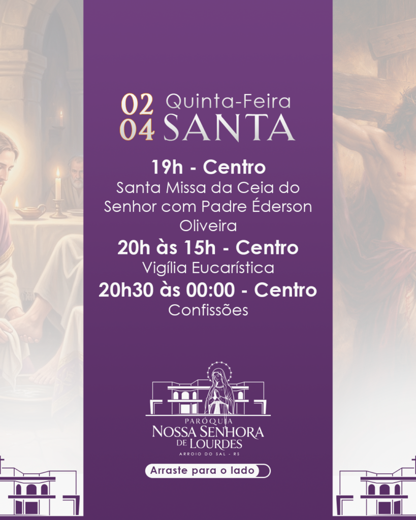 - Quinta-feira, dia 2, 19h: Santa Missa da Ceia do Senhor