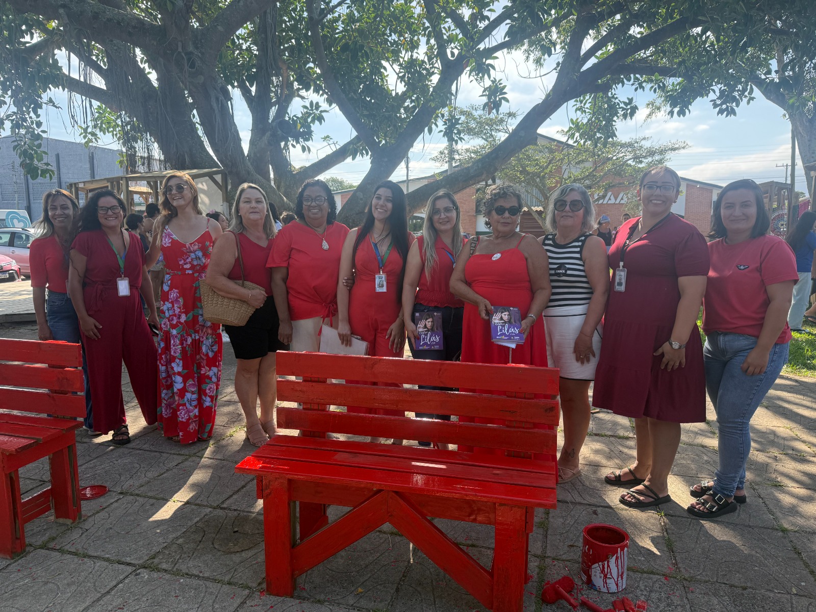 Atualmente, estima-se que 55% dos servidores públicos de Arroio do Sal sejam mulheres. Por isso, a pintura coletiva de novos bancos vermelhos, que serão distribuídos por Arroio do Sal, foi um dos momentos de maior simbolismo. A ação contou com a participação de Denise Argemi, coordenadora nacional do projeto Banco Vermelho, de enfrentamento ao feminicídio. A campanha internacional utiliza a instalação de bancos vermelhos em espaços públicos, simbolizando o sangue das vítimas e chamando a atenção da sociedade para a violência contra a mulher, além de divulgar os canais de denúncia.