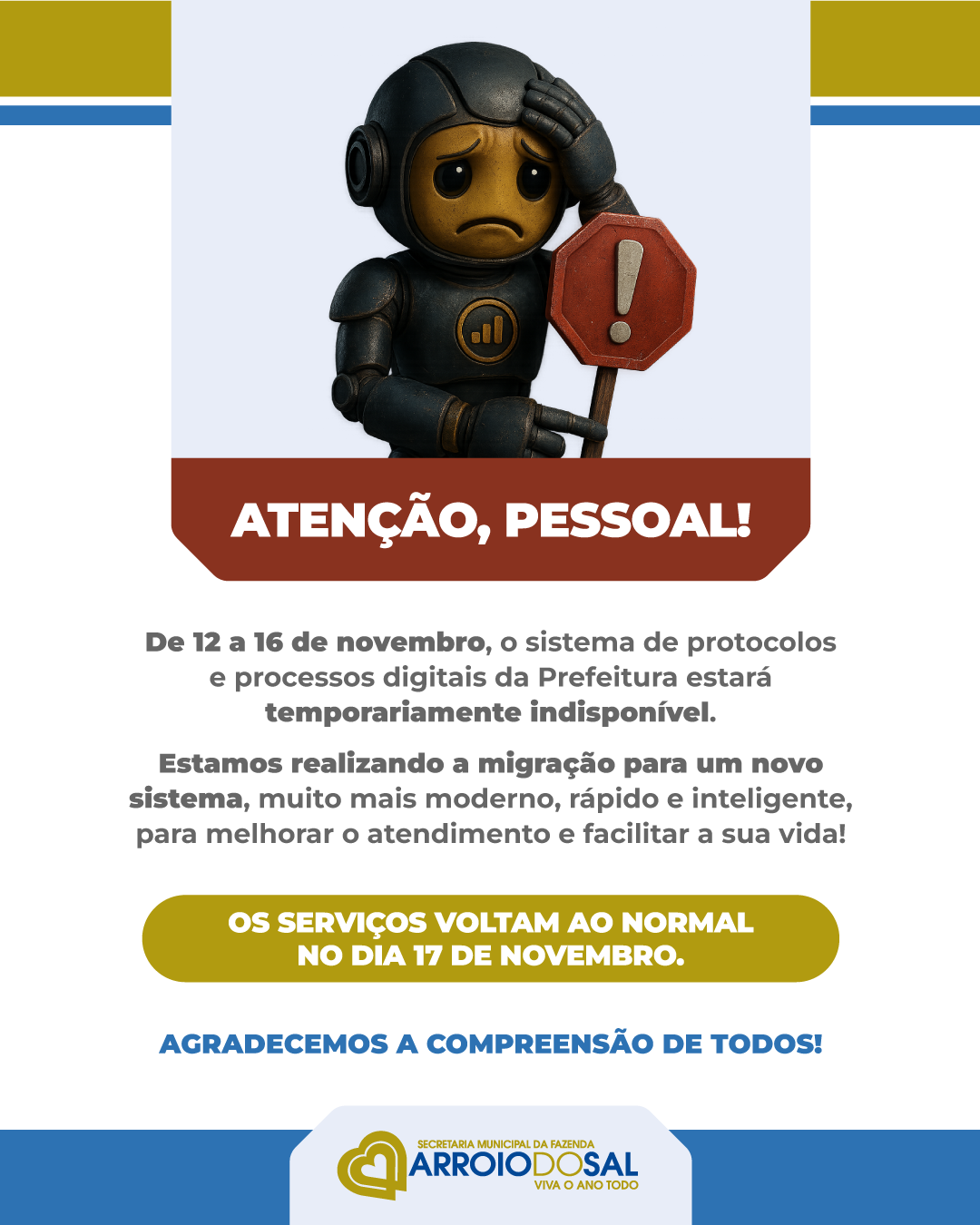 As equipes da Prefeitura de Arroio do Sal desde já agradecem a colaboração e compreensão da comunidade durante este período temporário de indisponibilidade e reforçam seu compromisso com a inovação e o bom atendimento público.