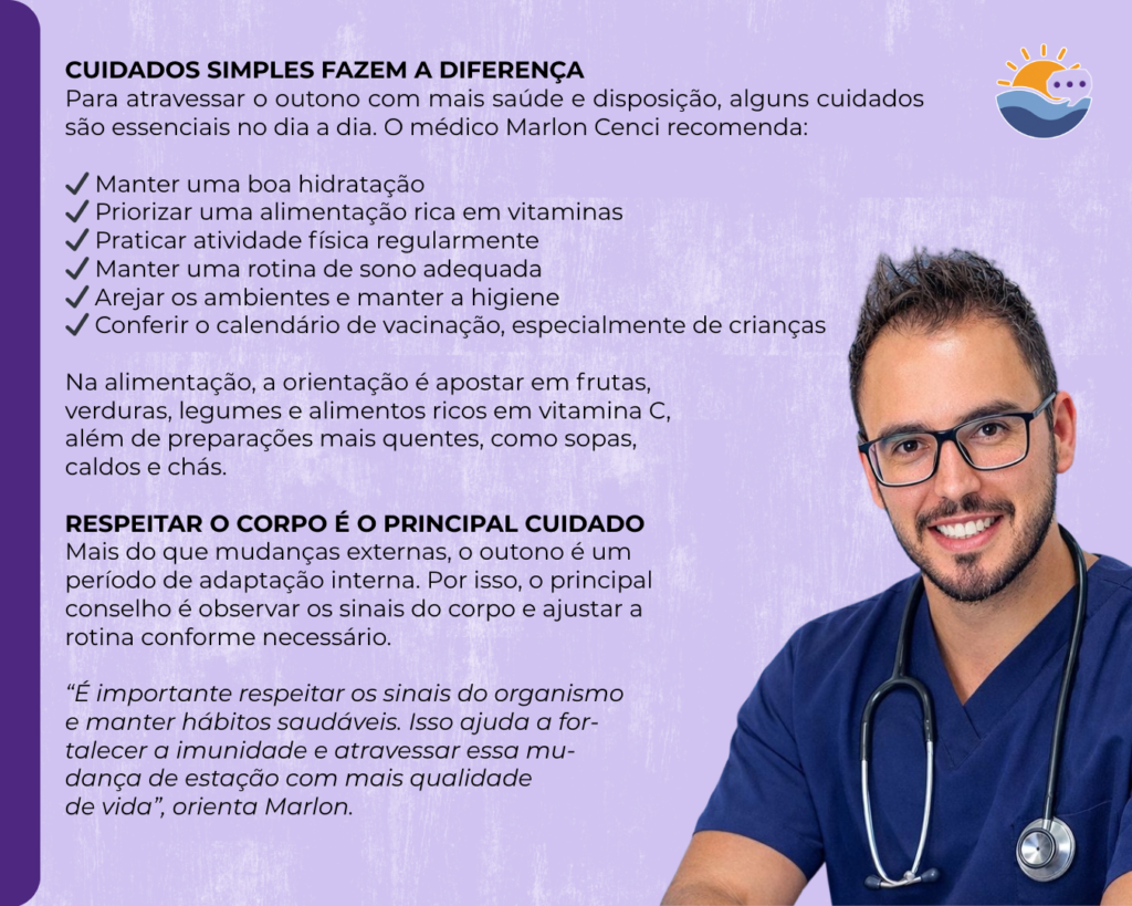 A troca de estação também exige mais atenção com a saúde. Segundo o médico, o organismo passa por uma fase de readaptação, o que pode deixar a imunidade mais vulnerável, especialmente quando há fatores como estresse, má alimentação ou sono irregular.