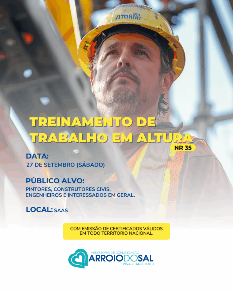 A Prefeitura de Arroio do Sal, por meio da Vigilância em Saúde do Trabalhador e do Departamento de Segurança do Trabalho, promoverá no sábado, dia 27 de setembro, o Treinamento de Trabalho em Altura (NR 35). Gratuito e aberto para toda a população, o curso será realizado na SAAS (Sociedade de Amigos de Arroio do Sal), em dois turnos de atividades: das 8h às 12h e das 13h às 17h.