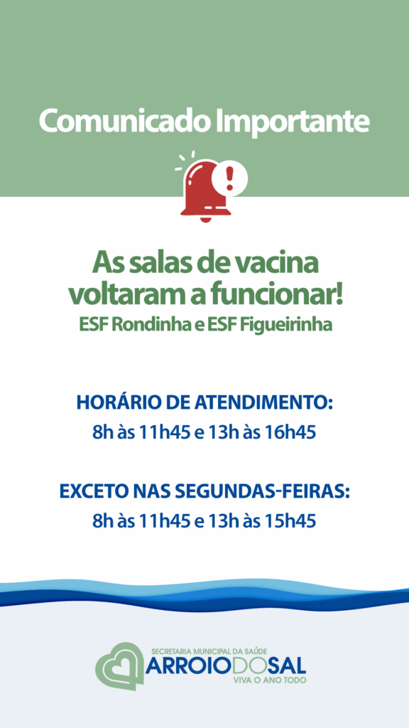 A Prefeitura Municipal de Arroio do Sal e a Secretaria Municipal da Saúde informam à população que as salas de vacina das ESFs (Estratégia de Saúde da Família) dos balneários Rondinha e Figueirinha retomaram o atendimento normal nesta segunda-feira (29).